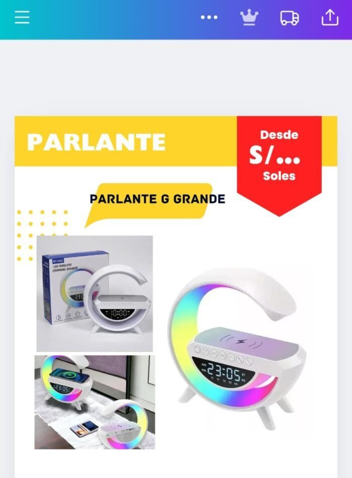 Parlante G grande con reloj, cargador e iluminacion.