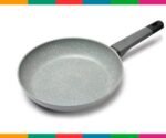 Fabricado en aluminio forjado con 4 capas de recubrimiento antiadherente, tipo piedra. Mango antiresbalante atornillado y amplio cortafuego. Espesor de 3,5 mm que le proporciona larga vida útil. Los alimentos no se pegan.